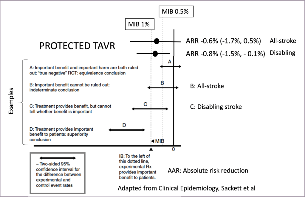 How do we determine a minimally important benefit? Although this estimation may come from multiple sources, I will cite a recent one totally unrelated to cerebral protection in TAVR. We are developing a guideline for PCI vs CABG in left-main disease in Latin America. We asked the panel, composed of clinical cardiologists, cardiac surgeons, and interventional cardiologists, which is the minimally important benefit for periprocedural all-stroke for PCI vs CABG. Although this is not definitive, the current median value is 8 per 1,000 treated (-0.8% difference), NNT 125. Consider that this is all stroke, so disabling stroke is likely to be even smaller. Also, in another source for the use of “safe acute interventions,” the minimal important difference among academic neurologists ranged from 0.8% to >2%.